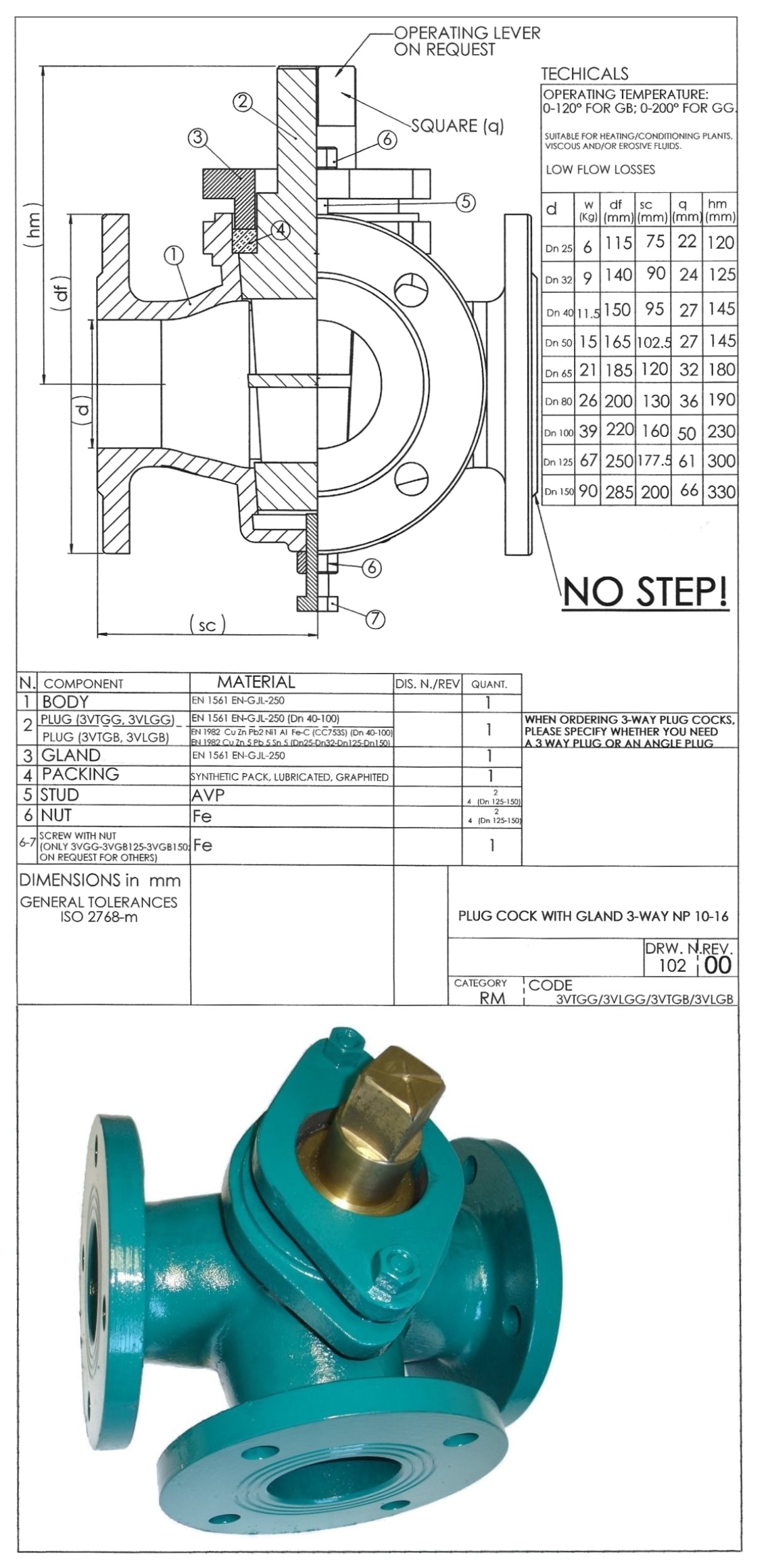PLUG COCK WITH GLAND 3-WAY NP 10-16